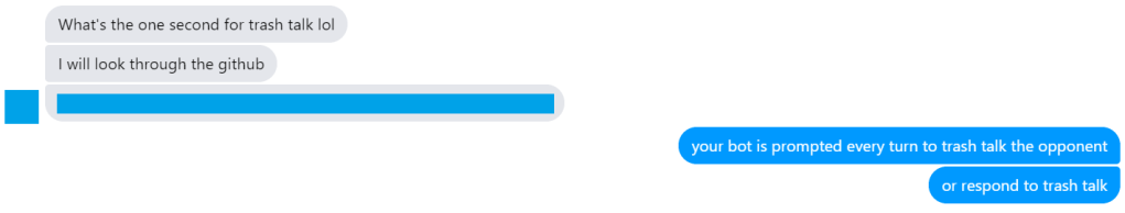 Trash talk is a “fun” optional feature in this competition where your bot is prompted to make a short statement after each move. That statement is passed onto the opponent, who may formulate their next trash talk message with the previous one in mind.