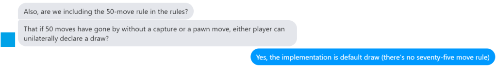 - Five seconds to decide whether or not to offer/accept a draw. If you time out or throw an error here, the default assumption is that there is no draw. You may only offer a draw after your own move, not before.