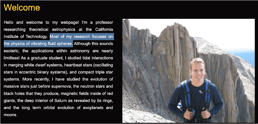 I ultimately chose to come to Caltech, knowing that I wanted to work with Jim Fuller, an early-career not-yet-tenured professor working on stars. Jim’s group was small and had only two grad students, one of whom was a classmate of mine at Berkeley. At the time, Jim’s website looked like this: